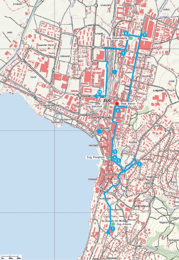 Der Industriepfad Stadt Zug umfasst zehn Informationstafeln an den eingezeichneten Standorten. Die Route ist nicht ausgeschildert. Weitere Tafeln werden laufend ergänzt.